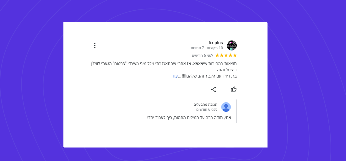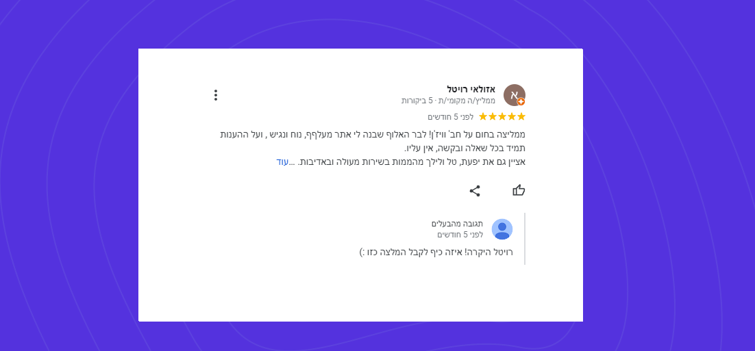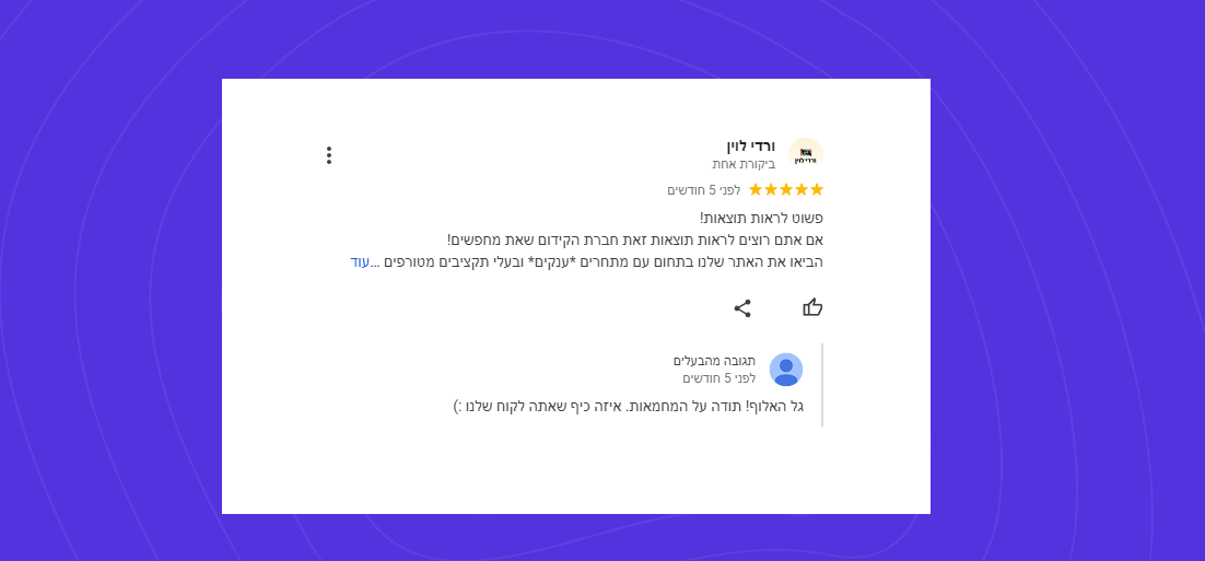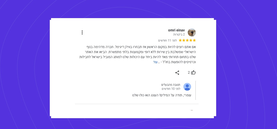 נכון, מרבית המוחלט כ-97% ביקורות 5 כוכבים, אז ישנם גם את ה-3% אותם לקוחות שמגיע להם להשמיע את קולם גם אם זה לא תמיד נעים לנו. אבל בזכותם למדנו לאורך השנים להתקמצע וללמוד.